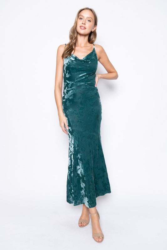 Autumn Burn Out Velvet Maxi Bias Cut Mesh Cowl Neck Dress