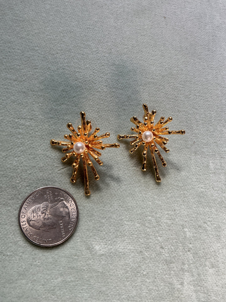 Brass Gold Plated hammered starburst pearl Stud Earrings