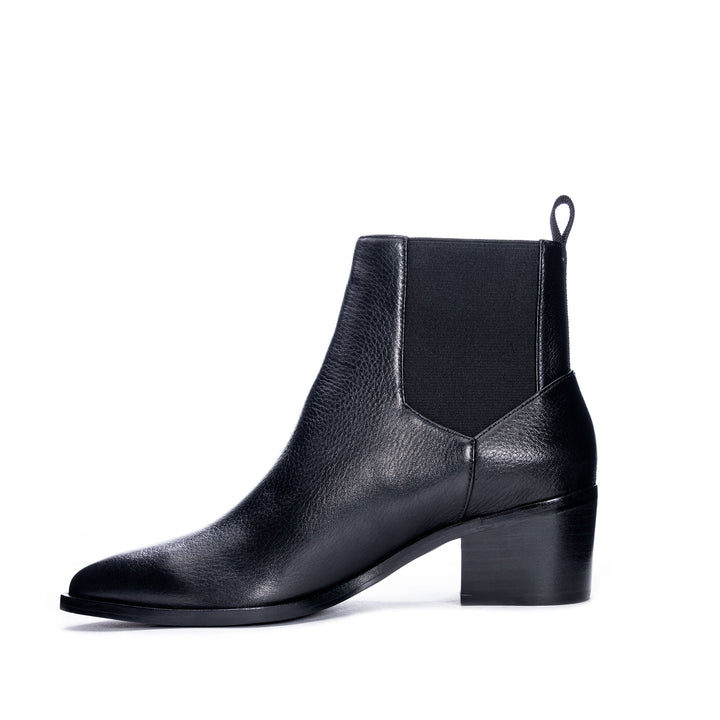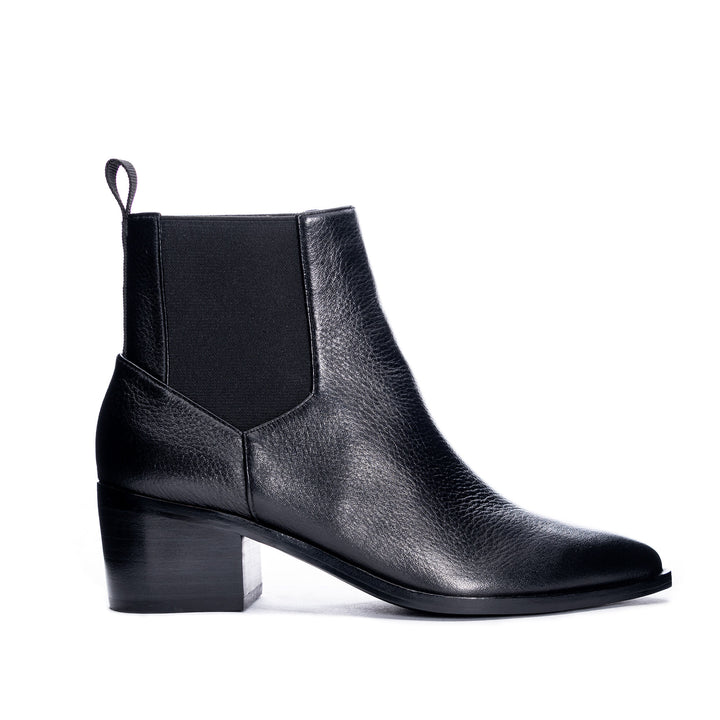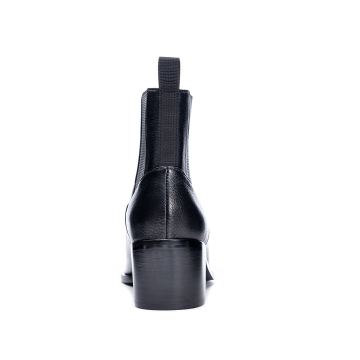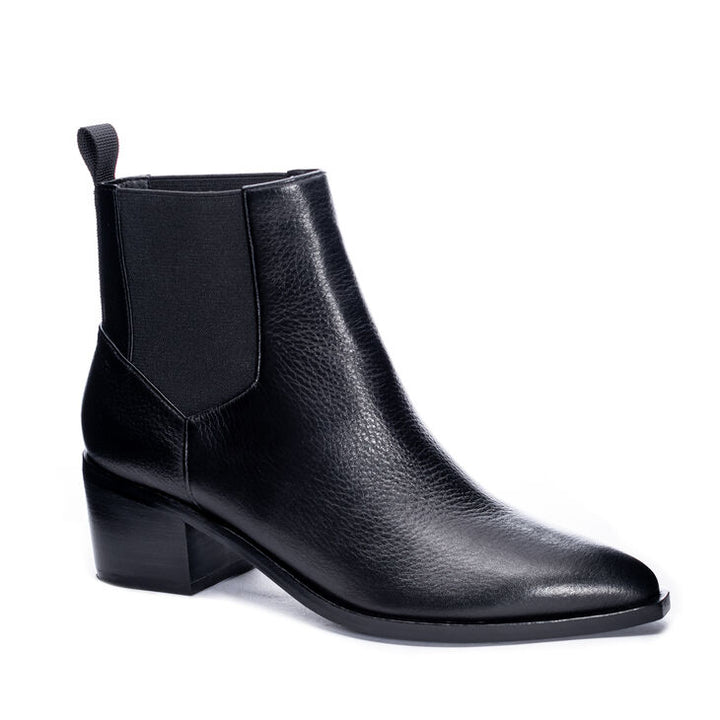 Classic and chic Filip bootie by Chinese Laundry. This chelsea style pull-on bootie has an appealing pointed toe, flexible side elastic panels, heel pull-loop, and a long-lasting sole with stacked block heel. Genuine leather.