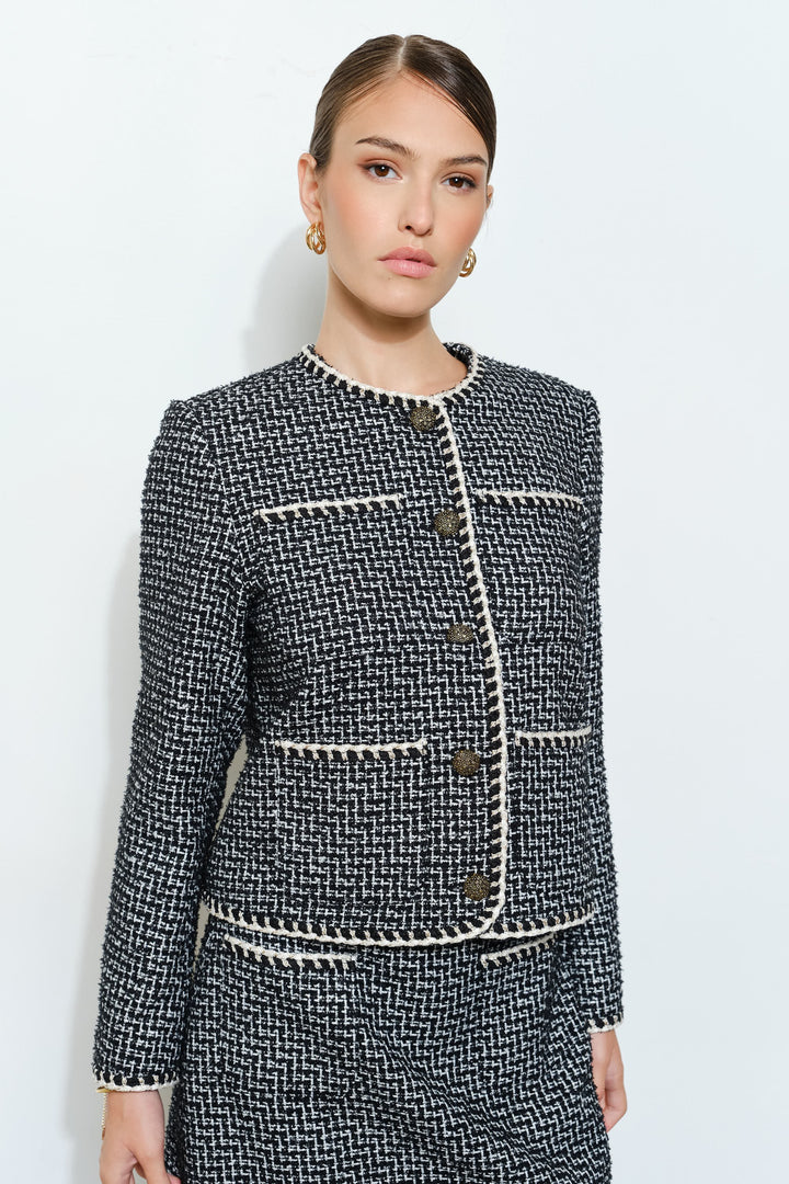Coco Chanel Style Boucle Tweed Braid Trim Jacket - White/Black