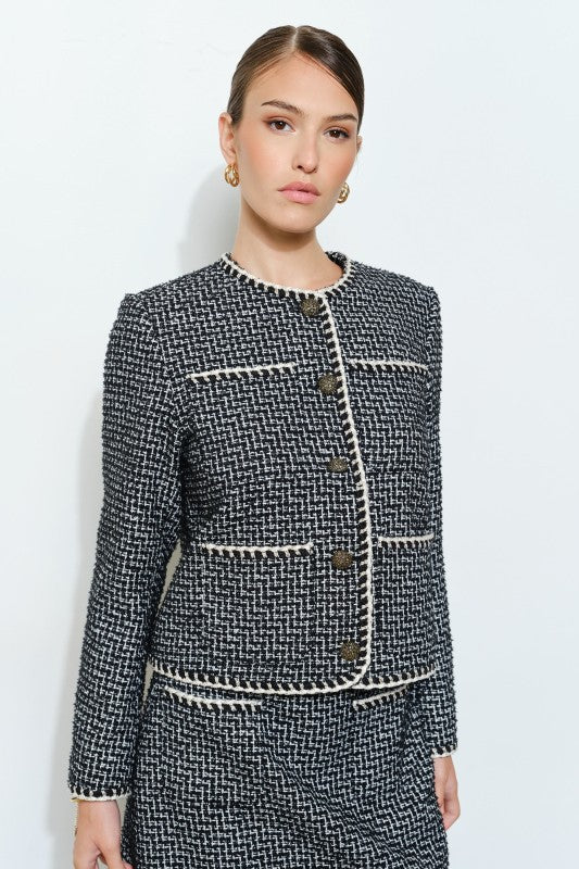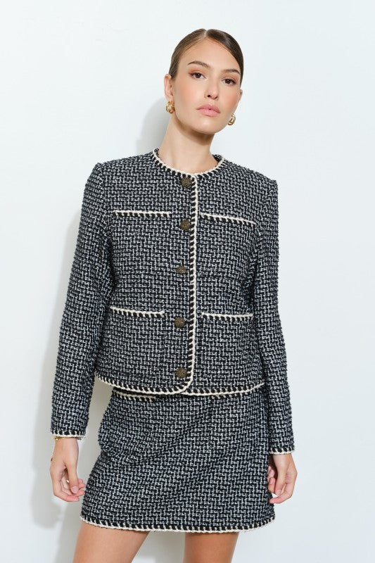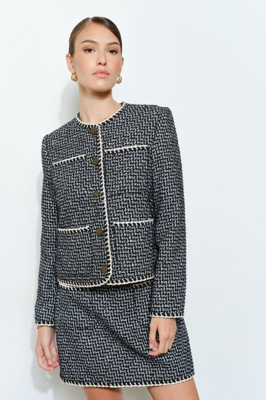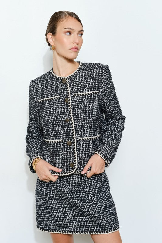 The Coco Chanel style jacket is timeless and exudes sophisticated elegance. Inspired by the ever chic Chanel boucle jacket, this single breasted 4-pocket design will elevate even a casual jeans and white tee outfit. Pair with the matching skirt for the chicest two piece set. Skirt available here.