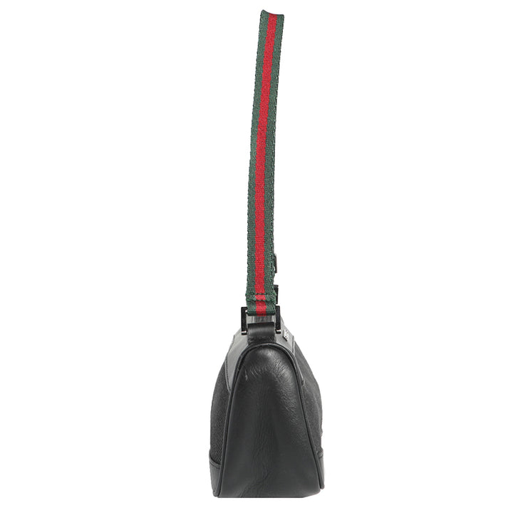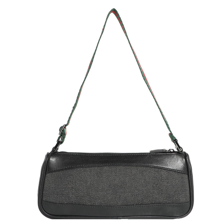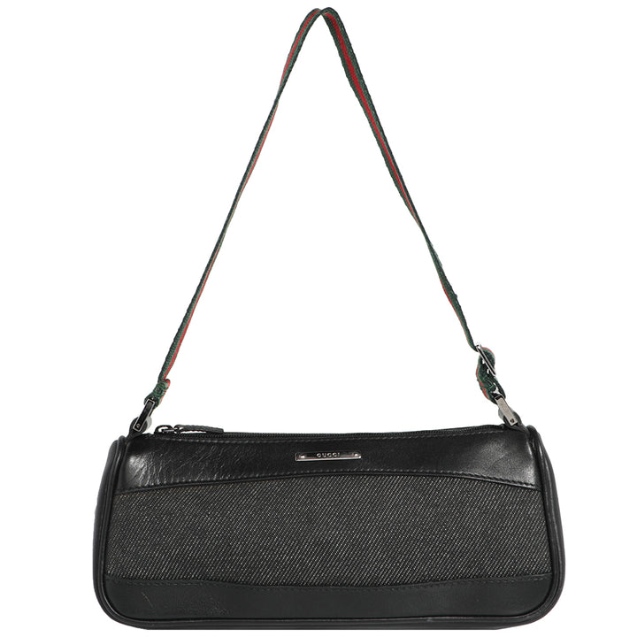 Vintage early 2000s Gucci mini striped shoulder bag. Bag is crafted out of high grade black denim and leather trim. Classic grosgrain stripe shoulder strap. Entire interior fabric is covered in GG logo. Gucci ID number: 92820 002058