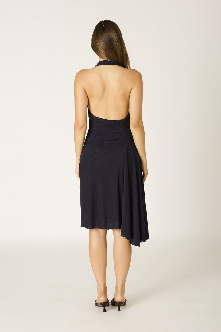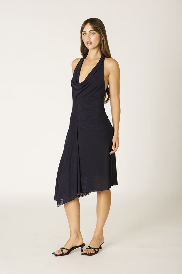 - This mesh midi dress features a draped cowl halter neckline with a fitted ruched bodice, open back, and an asymmetrical hemline.