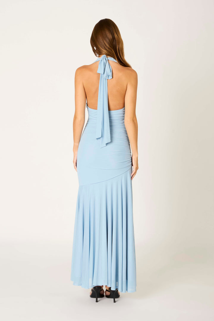 MARISELA MESH HALTER TIE BACK RUCHED DROP WAIST MAXI LONG DRESS