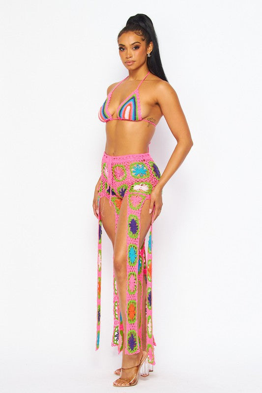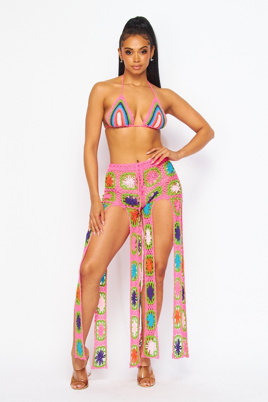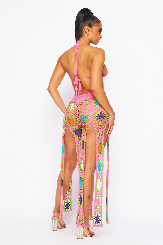 Vacation is just an outfit change away with the beachy Oasis set. The classic 70s grandma crochet square gets a y2k refresh in this hot pink hue. Mid rise drawstring waist shorts with swishy car wash fringe gives this set a modern boho vibe. Style the bikini top with vintage cut off jean shorts and daddy's button shirt to downplay the drama. Wear it to a music festival or the beach, she belongs everywhere.