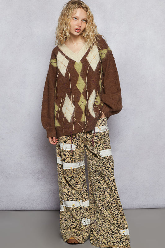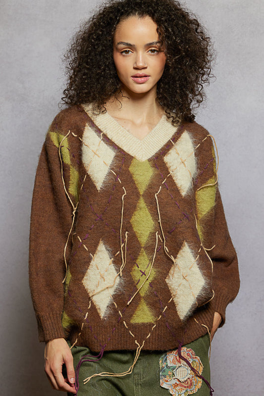 Oxford Argyle Distressed Oversized Sweater - Matcha/Mocha