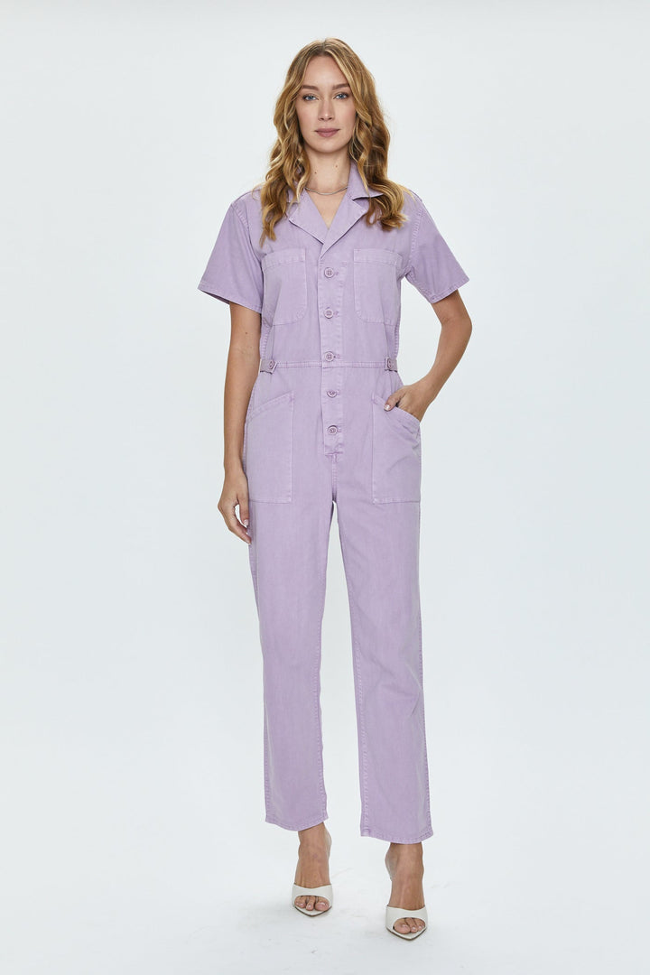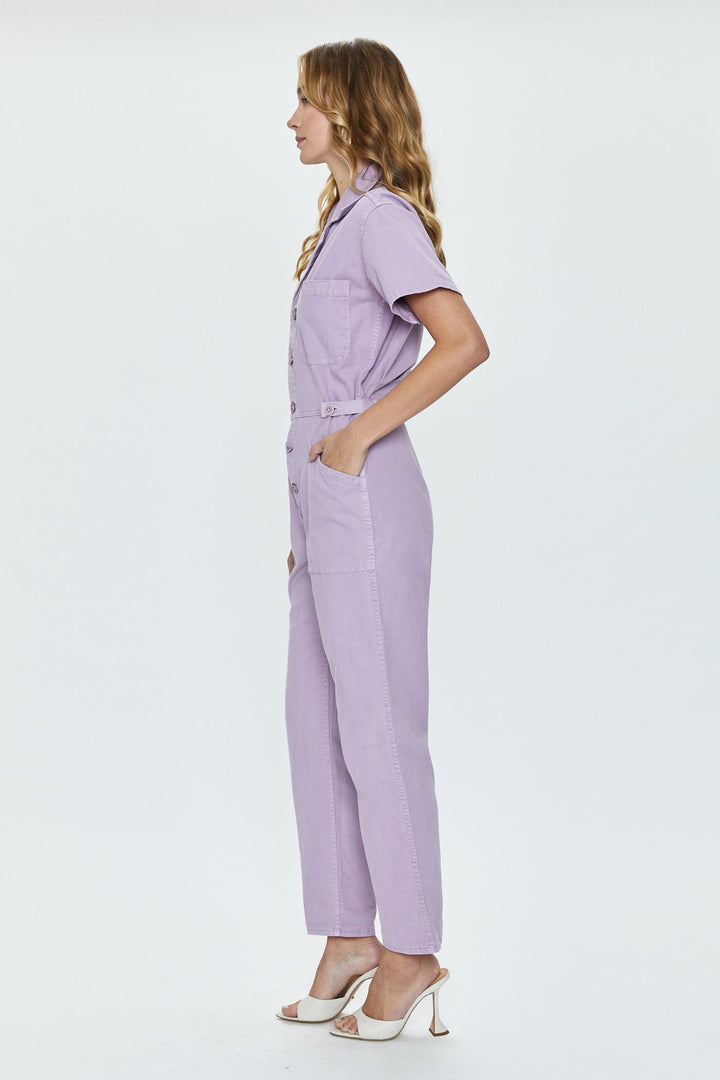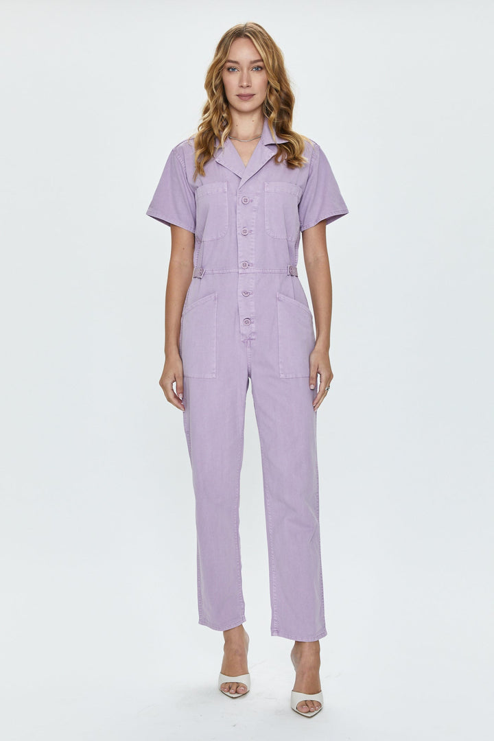 The Grover jumpsuit has been a staple in every color in our boutiques for over 3 years. It's versatility coupled with its comfort factor made it an instant best seller. Pistola has created a new pastel lavender called Iris. The fabric on this new style is lighter weight cotton than the usual almost denim-like cargo fabric.