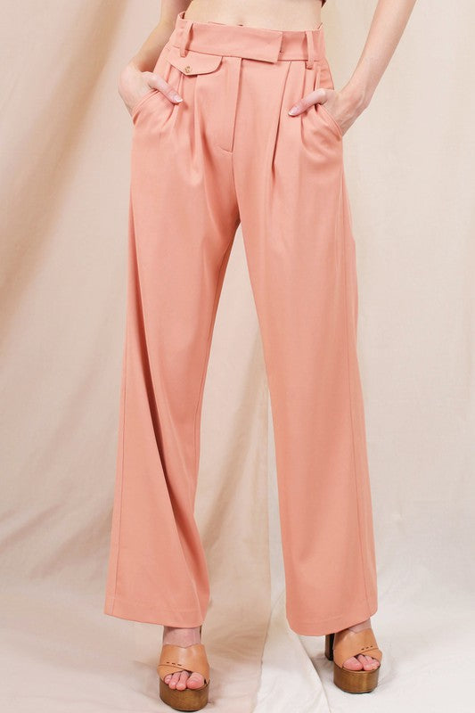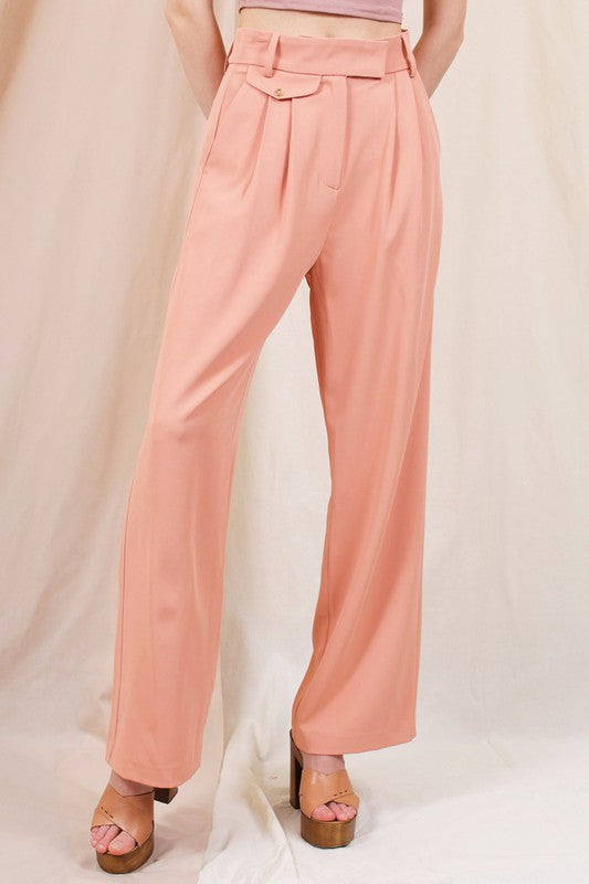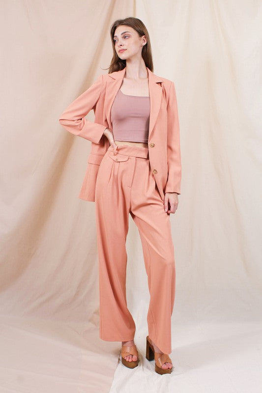 Ever girl needs a pair of these in her fashion round up. The Tracy trouser is a tailored high waisted wide leg pant featuring a tiny faux pocket at the waist and deep slit slit kangaroo pockets as well as back welt faux pockets. Team these classic pants with everything from a silky blouse and a blazer to a band tee and sneakers. They will quickly become a favorite to play with in your wardrobe. The warm peach fuzz color make them neutral and easy to pair with a myriad of other colors from white to red to tan to black.