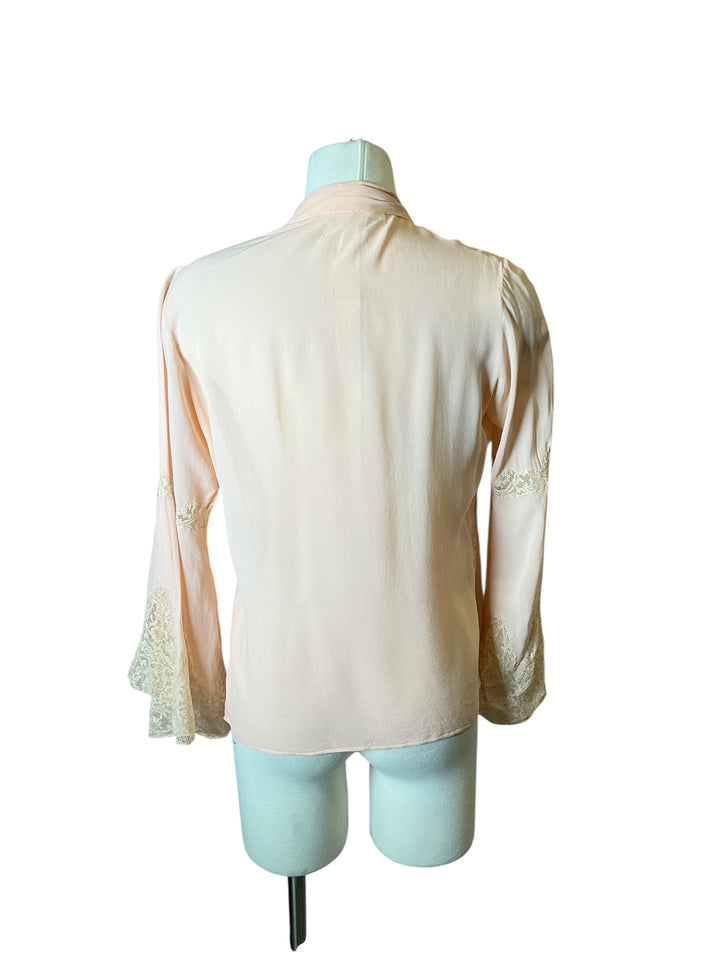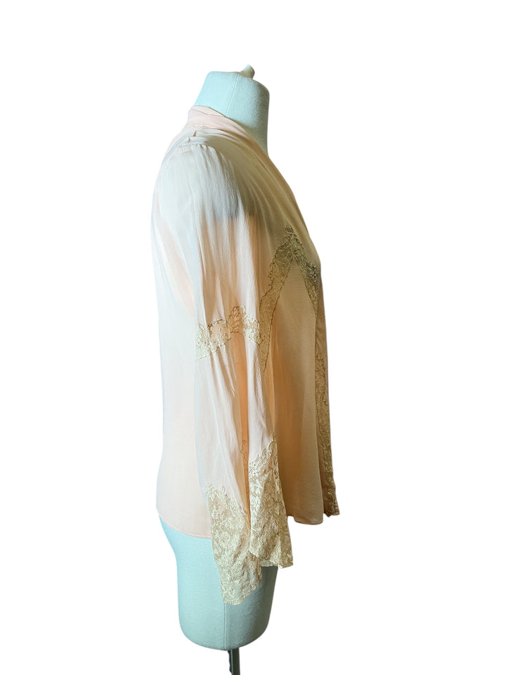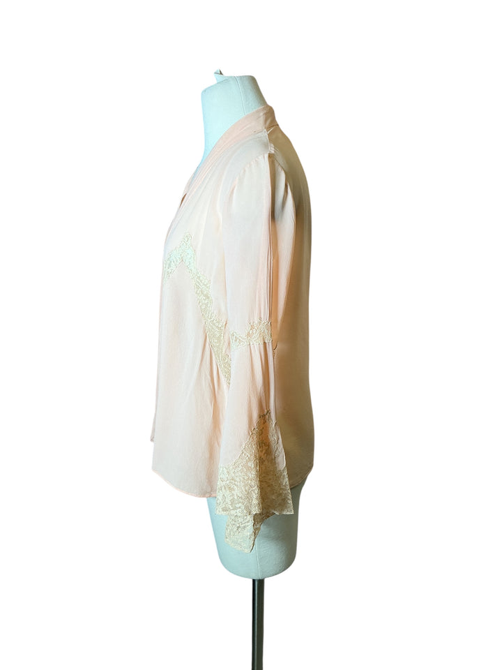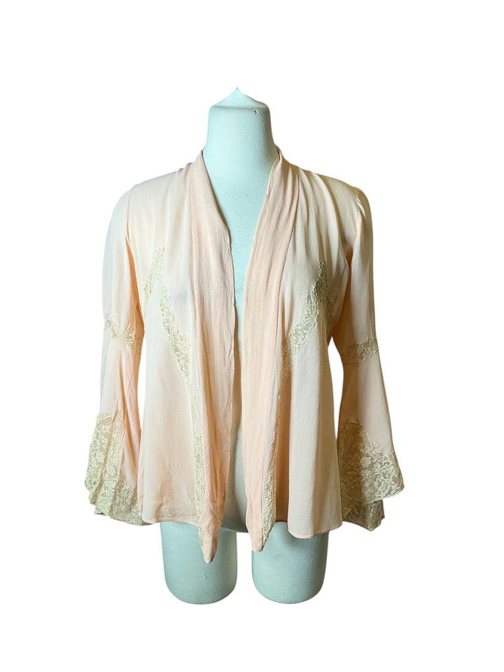 Vintage 1930s silk lace bell sleeve duster robe crop bed jacket S