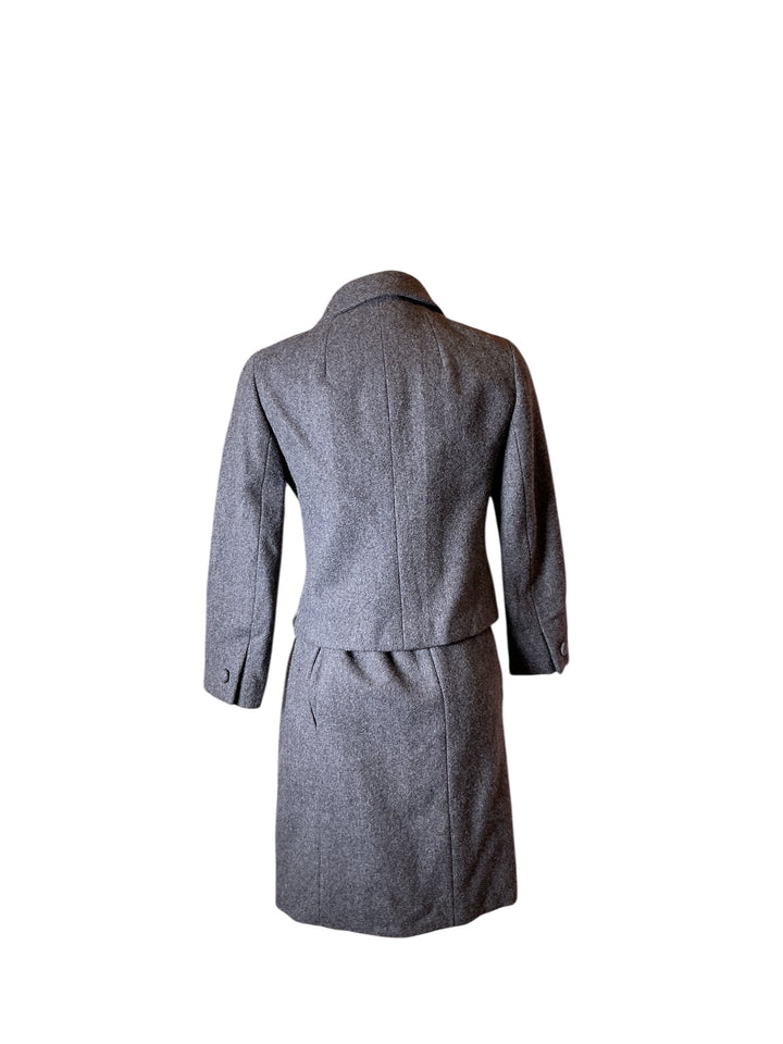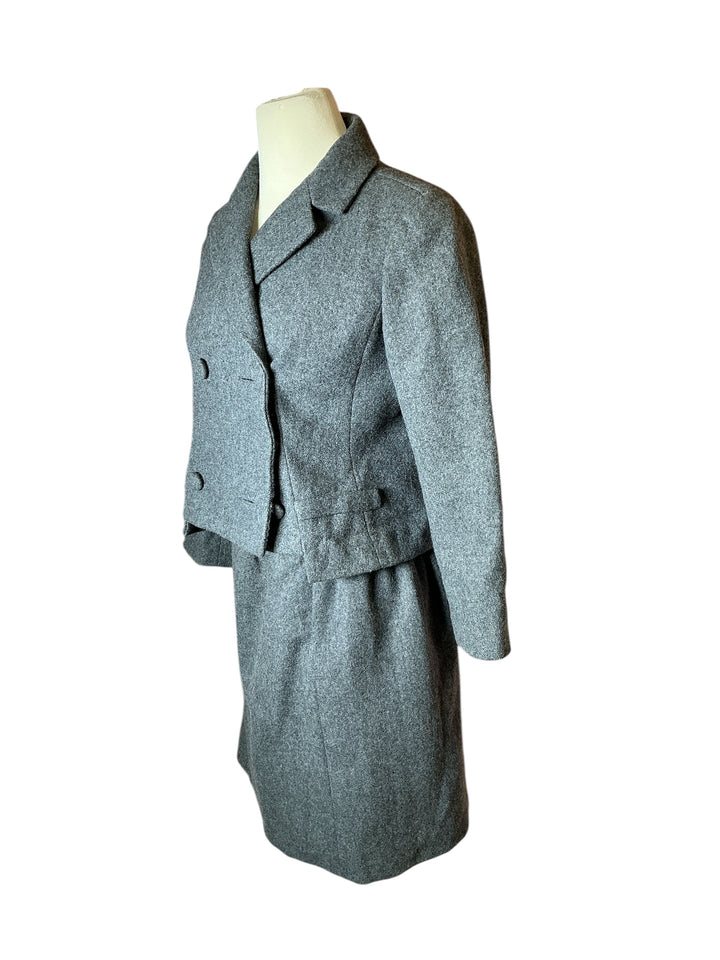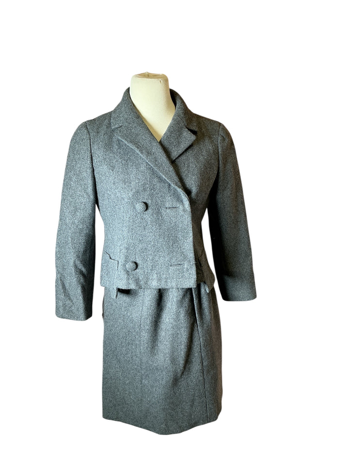vintage 1960s Christian Dior boxy wool shark Grey double breasted jacket and skirt two piece matching set S