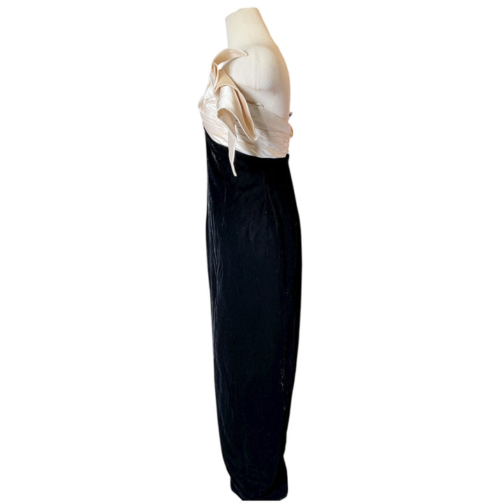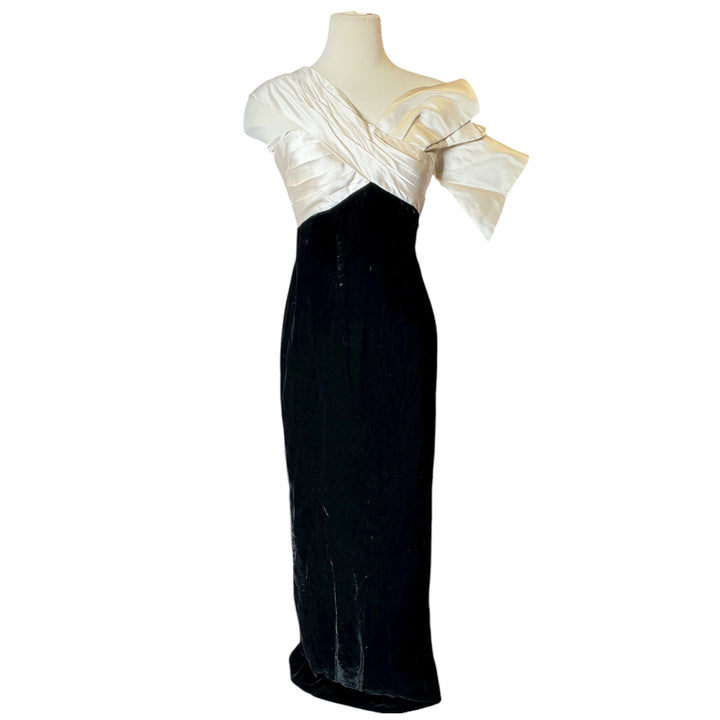 Vintage 1980s Victor Costa Velvet Satin Pleated One Shoulder Formal Gown