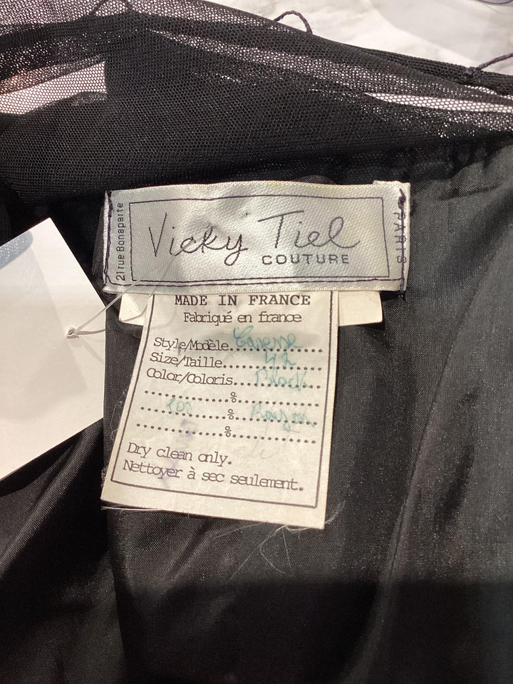 Vintage 80’s Vicky Tiel Couture Roached with Mesh Sleeve. Features a built in bustier. Some signs of wear, as shown in photographs, overall great condition! Made in France.