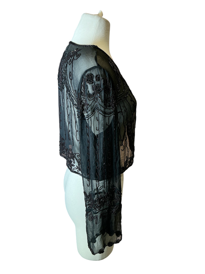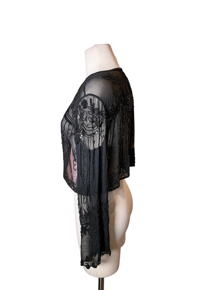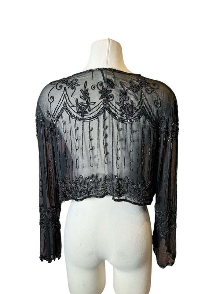 Vintage 80s Black Beaded Bolero Sheer Sequin Embellished Flapper Style shrug