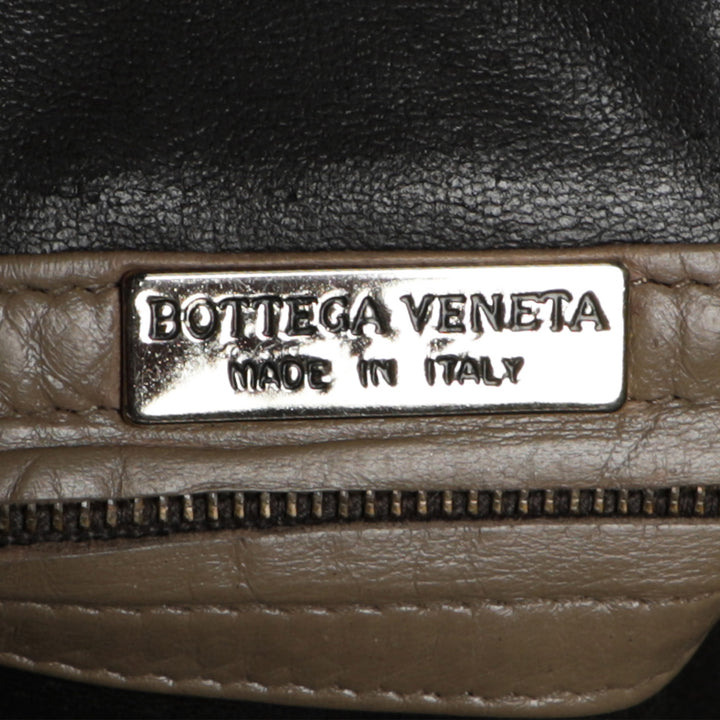 Chic leather Bottega shoulder mini duffel bag in the classic intrecciato woven leather. Rich neutral taupe color goes with everything and never goes out of style. Fully lined in leather. One large zippered pocket on the inside. Bottega gold hardware logo above pocket. Mini tassel zipper pull. Does not come with original box or dustbag. We will provide a dustbag.