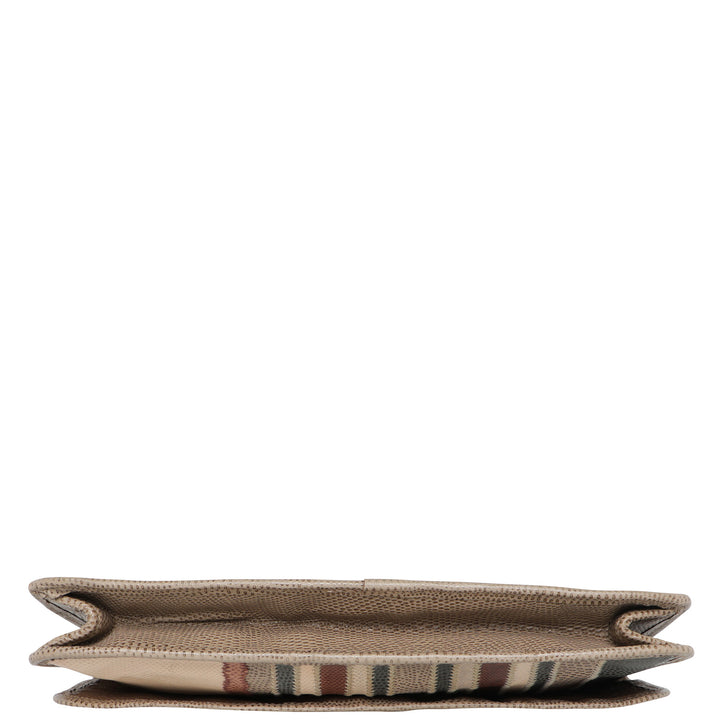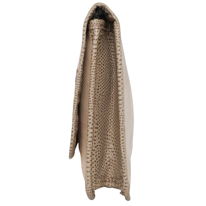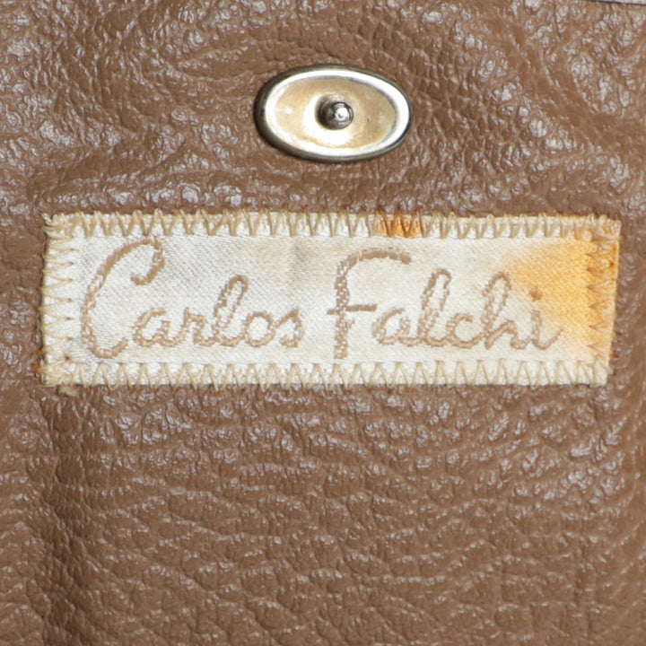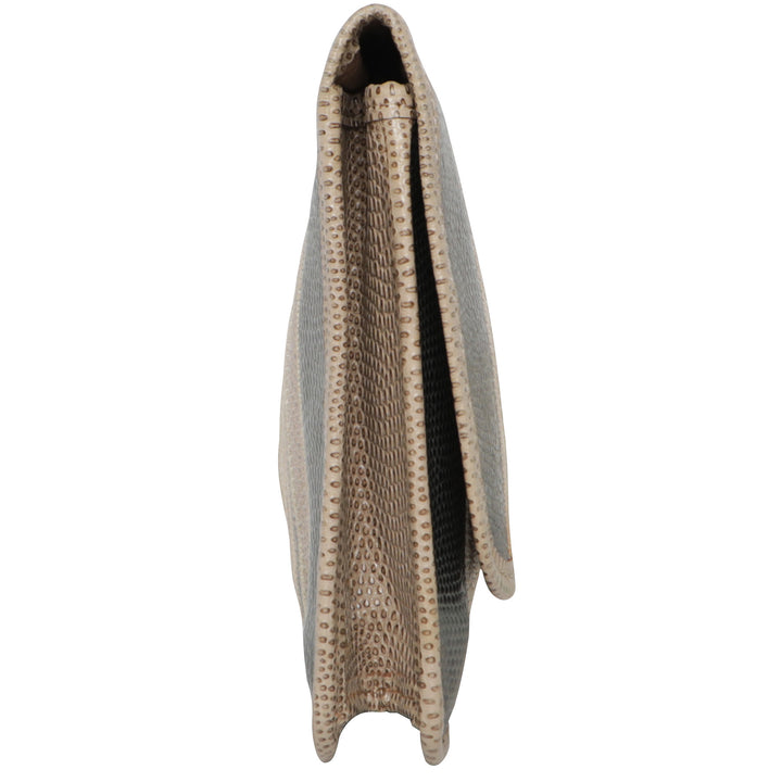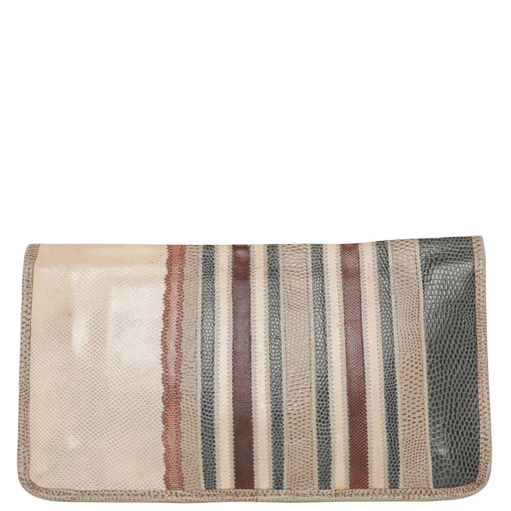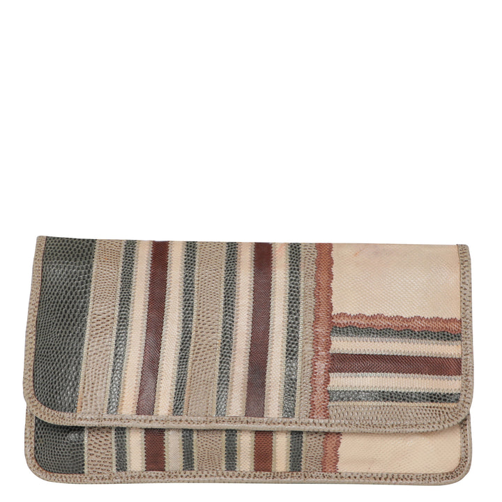 Vintage 1980s Carlos Falchi patchwork embossed vegan leather clutch. Funky mixed striped panels of leather artfully stitched together to form this fabulous vintage clutch. Neutral beige/chocolate and grayish browns make this bag a neutral closet staple. Classic envelope flap style, it closes seamlessly with magnetic metal button. Inside zippered pocket.Â