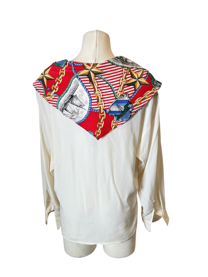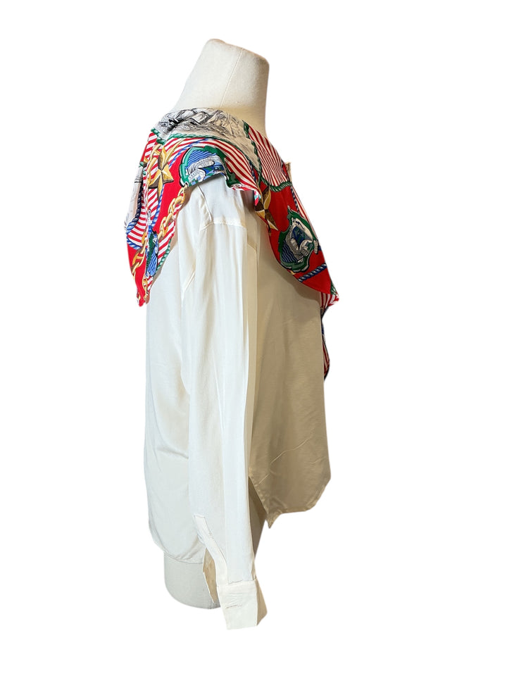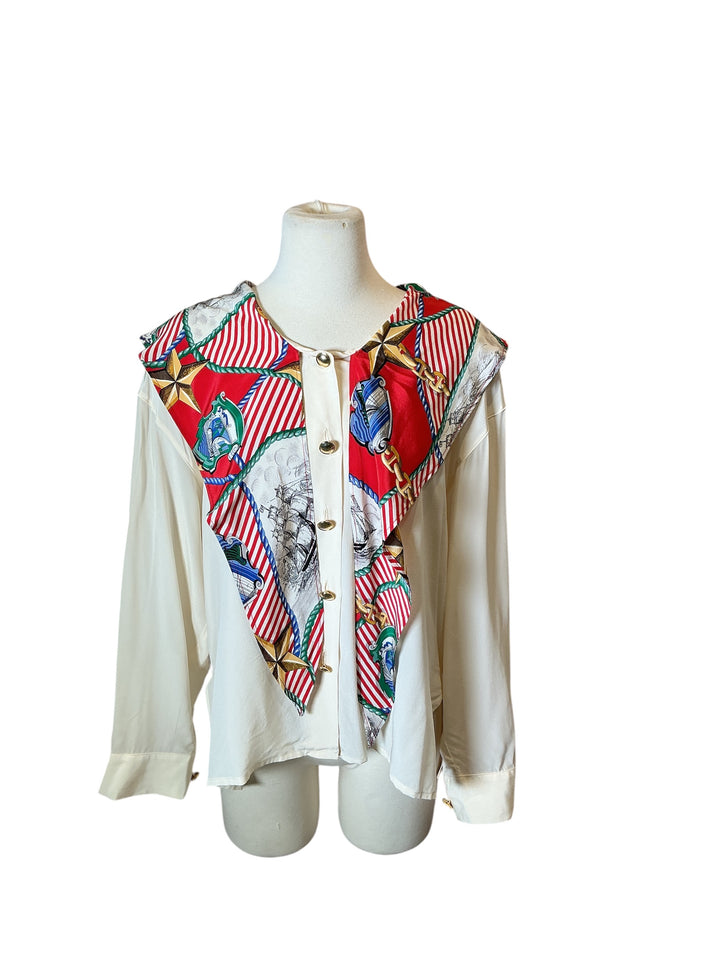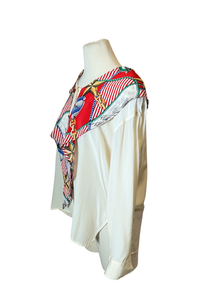 Vintage 80s Nautical Sailor scarfs Collar Maritime Print White Button Up top