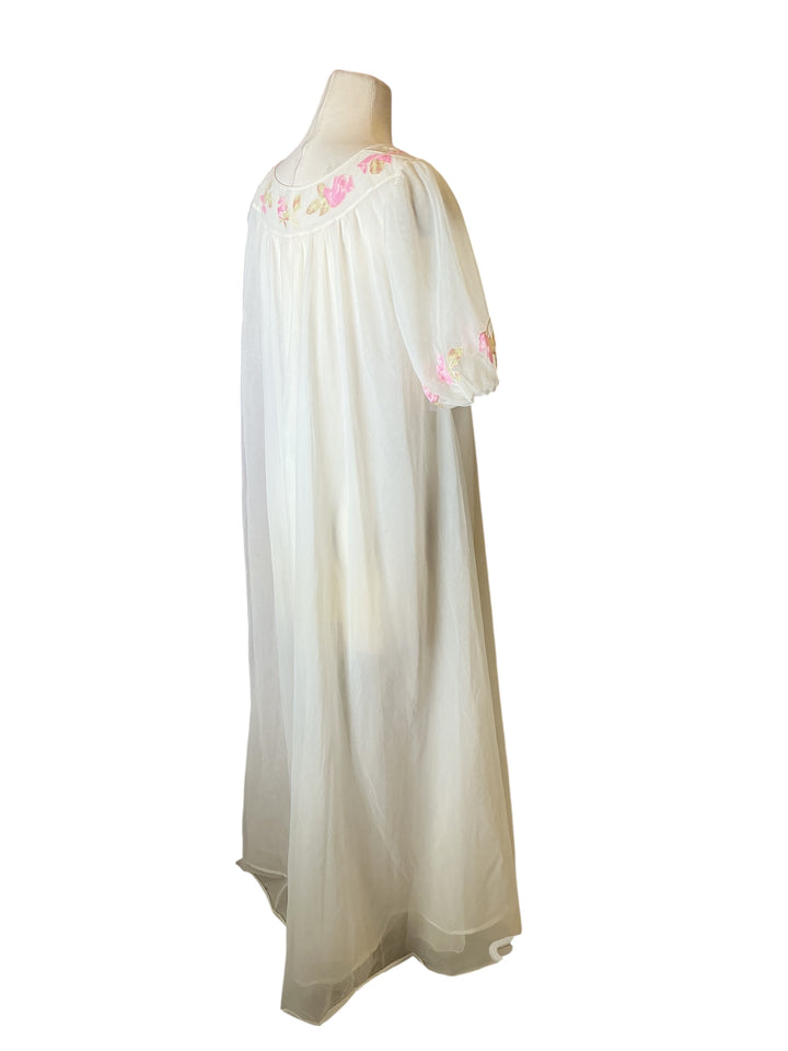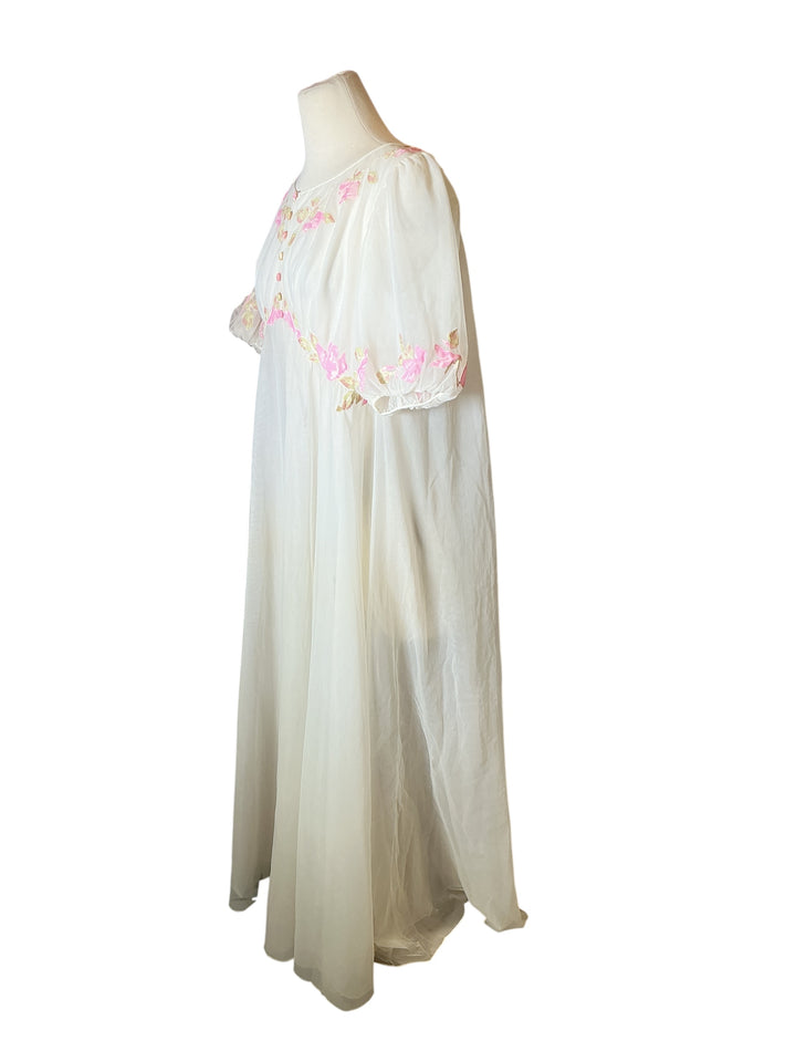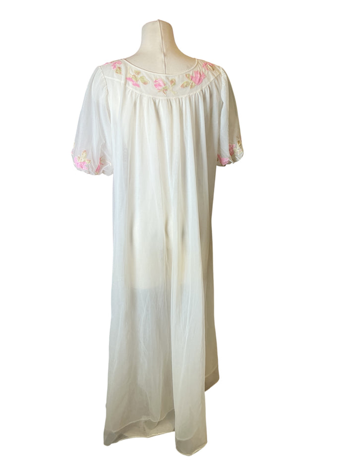 Vintage 80s nylon chiffon White Embroidered Floral Empire Waist robe dress 2 pc set M
