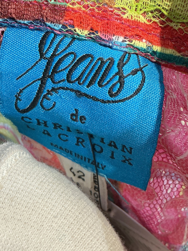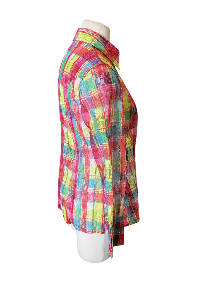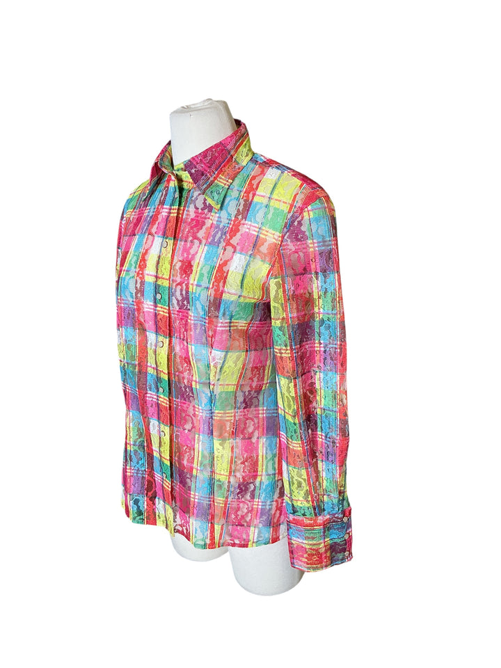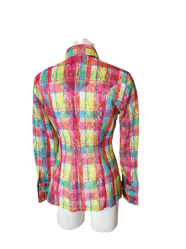 Vintage y2k Christian Lacroix Jeans Neon Plaid Lace Snap Button Western 70s Top medium