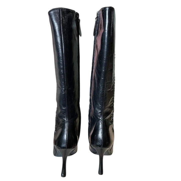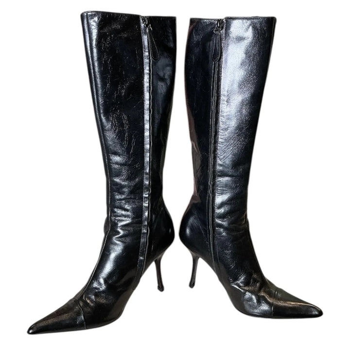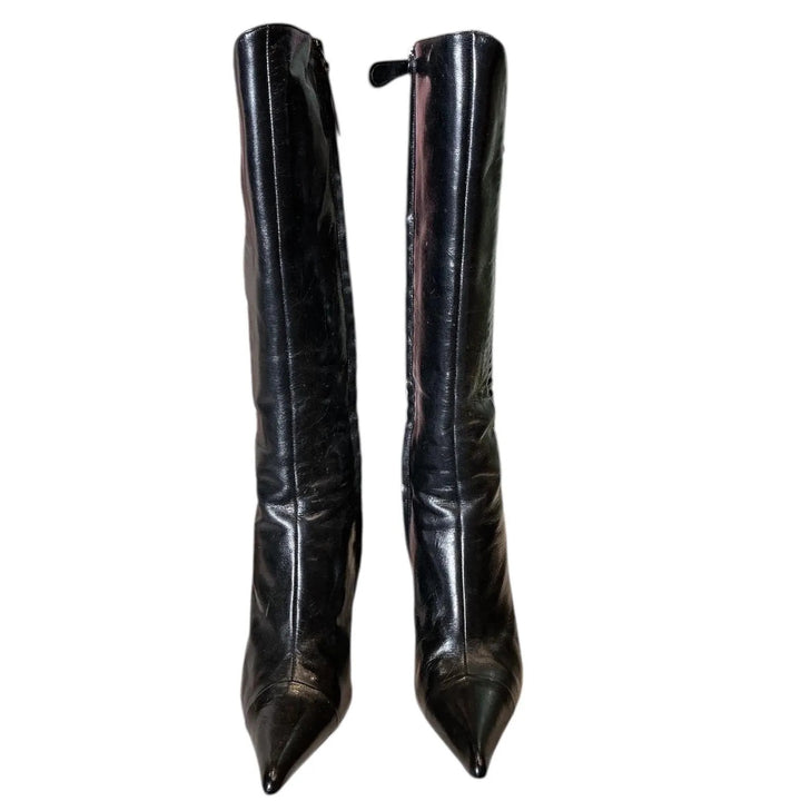 Vintage Y2K Cut Out Lines Point Toe Stiletto Leather Black Boots 6.5/7