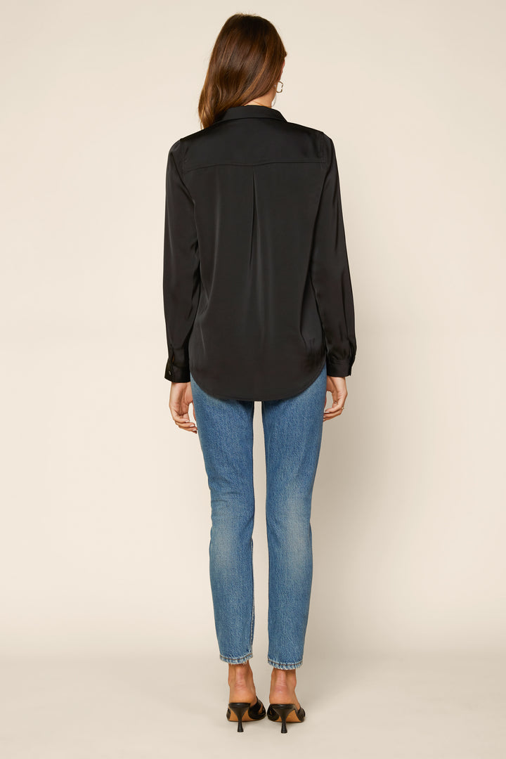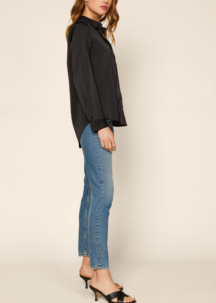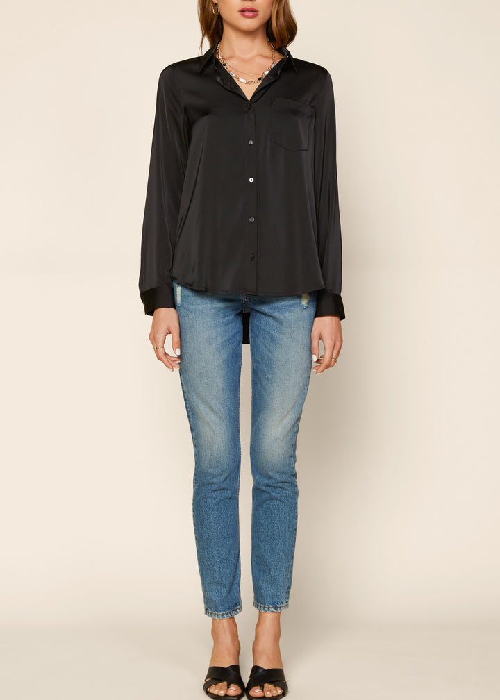 The Vivian satin button down blouse is a wardrobe essential. Perfectly placed pocket, slightly oversized, and pretty lucite mother of pearl earrings elevate this basic top.