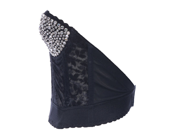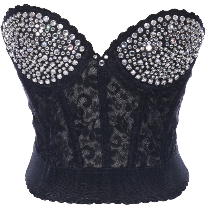 Vintage 'Like a Virgin' lace bustier with rhinestone grommets clustered all over the bust cups. Fully lined on the interior of cups. Double lined sheer black lace in bodice. 3 rows of hook and eye at the back waist. Plastic boned throughout the bodice.