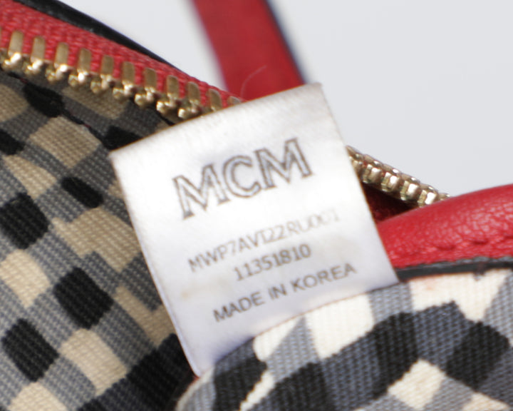 This is an authentic MCM Visetos Liz Shopper Tote Pouch in Ruby Red. This chic crossbody is crafted of visetos-coated canvas in red with MCM monogram printed in black. The bag features a leather shoulder strap and polished gold hardware. The top zipper opens to a printed fabric interior spacious for day or evening essentials. ID number: MWP7AVT22RU001